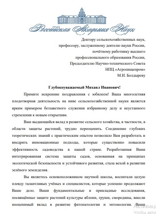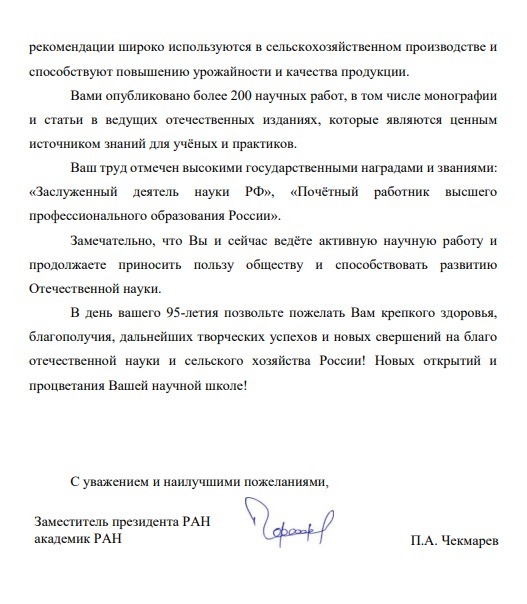 От имени Российской Академии наук тёплые слова поздравления, а также пожелания крепкого здоровья, благополучия, дальнейших творческих успехов и новых свершений на благо отечественной науки и сельского хозяйства юбиляру передал заместитель президента РАН академик РАН Пётр Чекмарёв.