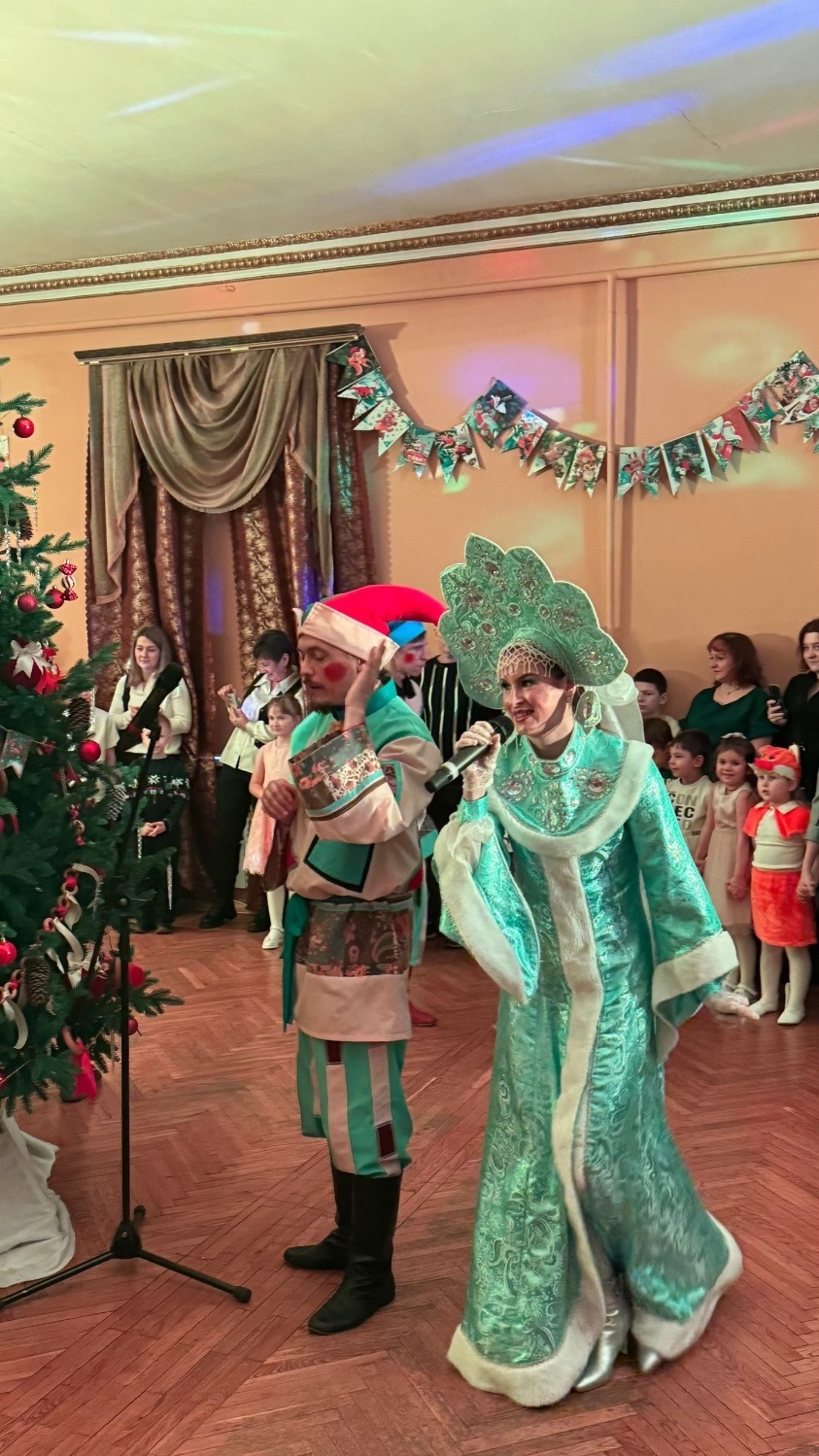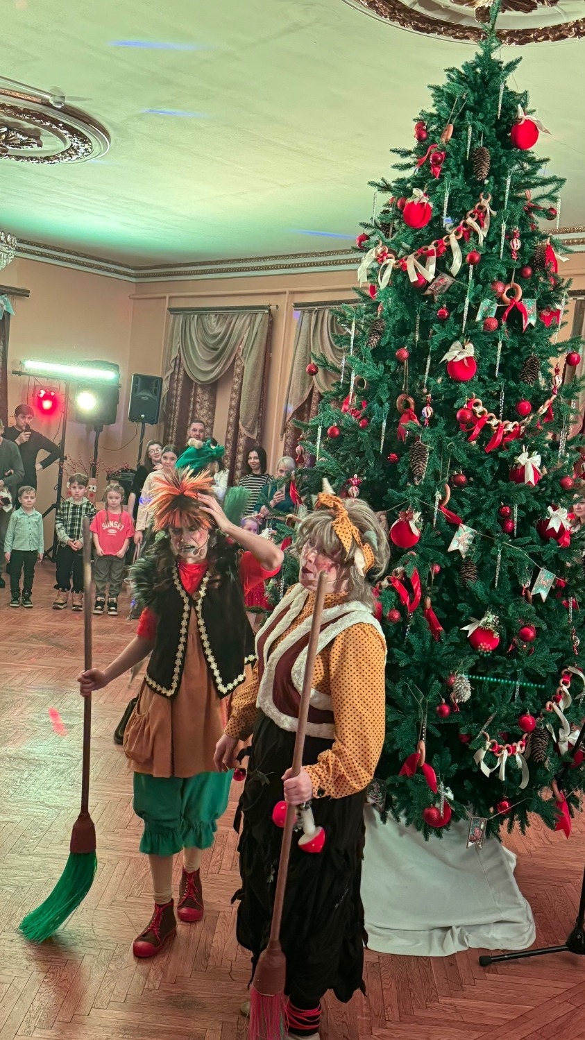 Заводилами праздника стали скоморохи Фома и Ерёма. Им противостояли целых три Бабы Яги, которые устроили бунт с требованием отмены Нового года. Ситуацию благополучно разрулили Дедушка Мороз и Снегурочка. Дети с удовольствием водили хороводы и танцевали под зажигательные мелодии.