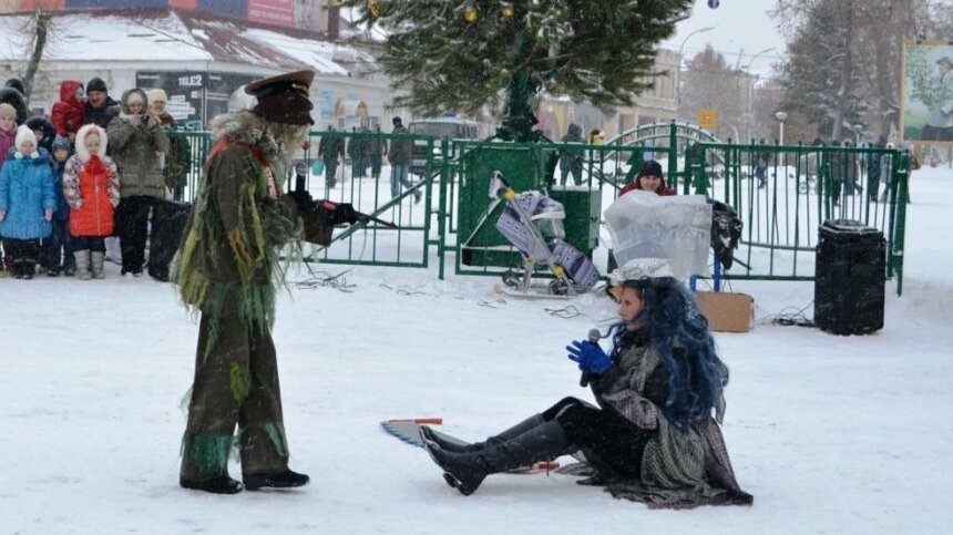 Сотрудники художественного отдела Парка культуры и отдыха не дали замёрзнуть ни ребятам, ни их родителям, перевоплотившись в сказочных персонажей и устроив замечательное театрализованное представление. Но сначала над главной колючей героиней любого новогоднего утренника нависла серьёзная угроза – её вздумала спилить коварная Баба Яга, чтобы затем продать вместе с другими ёлочками-сосёночками Кощею Бессмертному. Да только обиженный невниманием летающей на метле хозяйки Кот всё рассказал Снегурочке, а та позвала на выручку Деда Мороза.