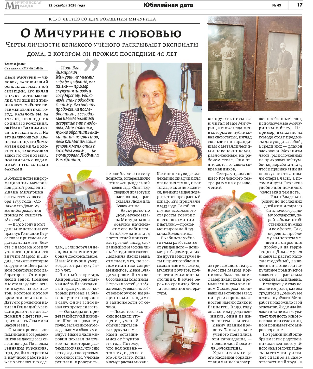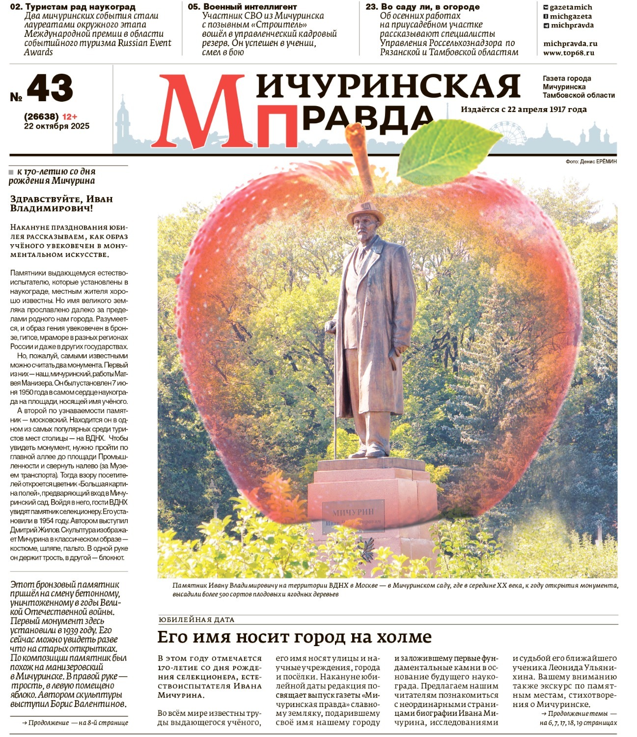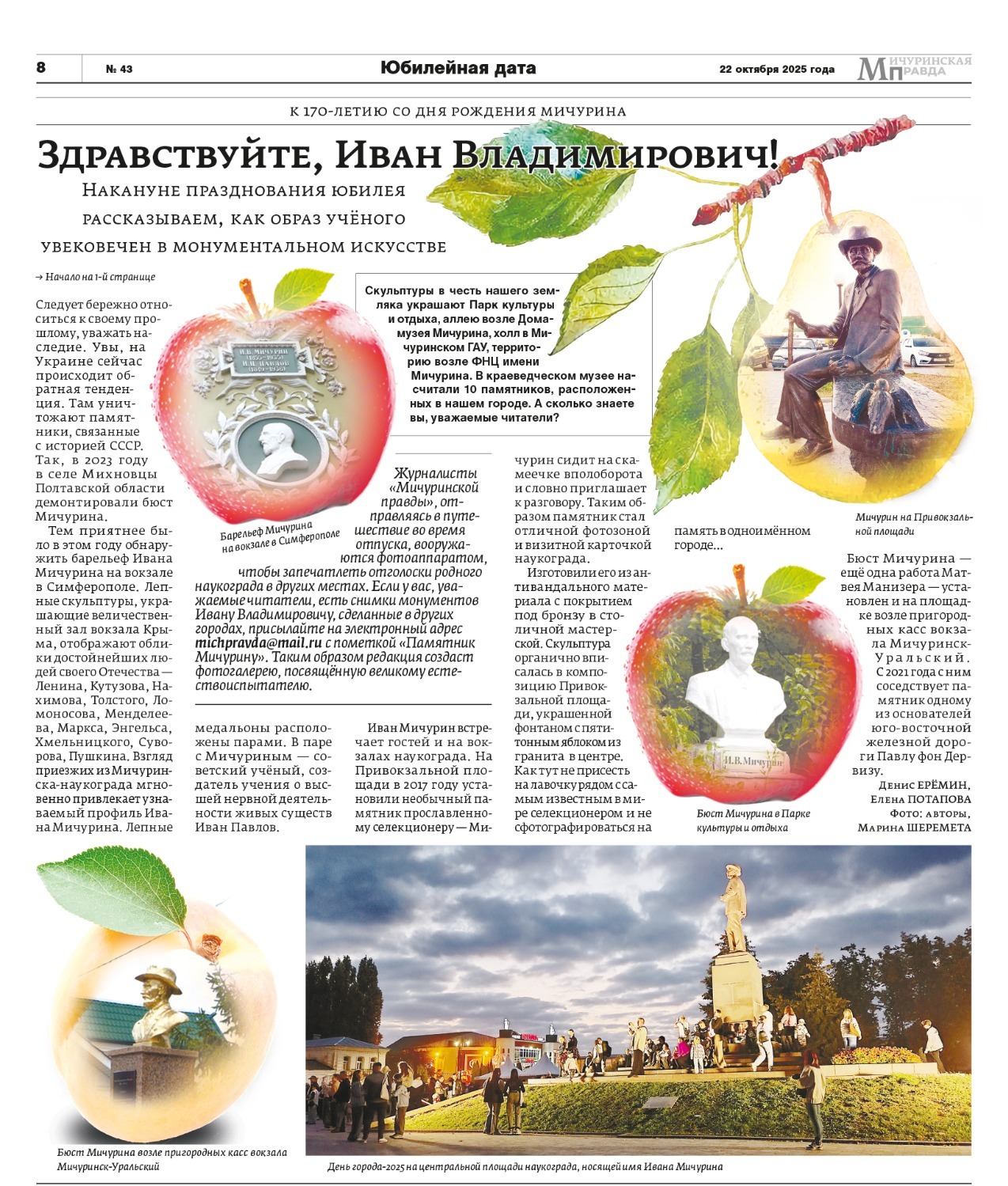 Несколько материалов журналисты посвятили Ивану Мичурину в номере газеты от 22 октября 2025 года. Внимание читателей, думается, привлекло и креативное оформление цветных полос газеты.