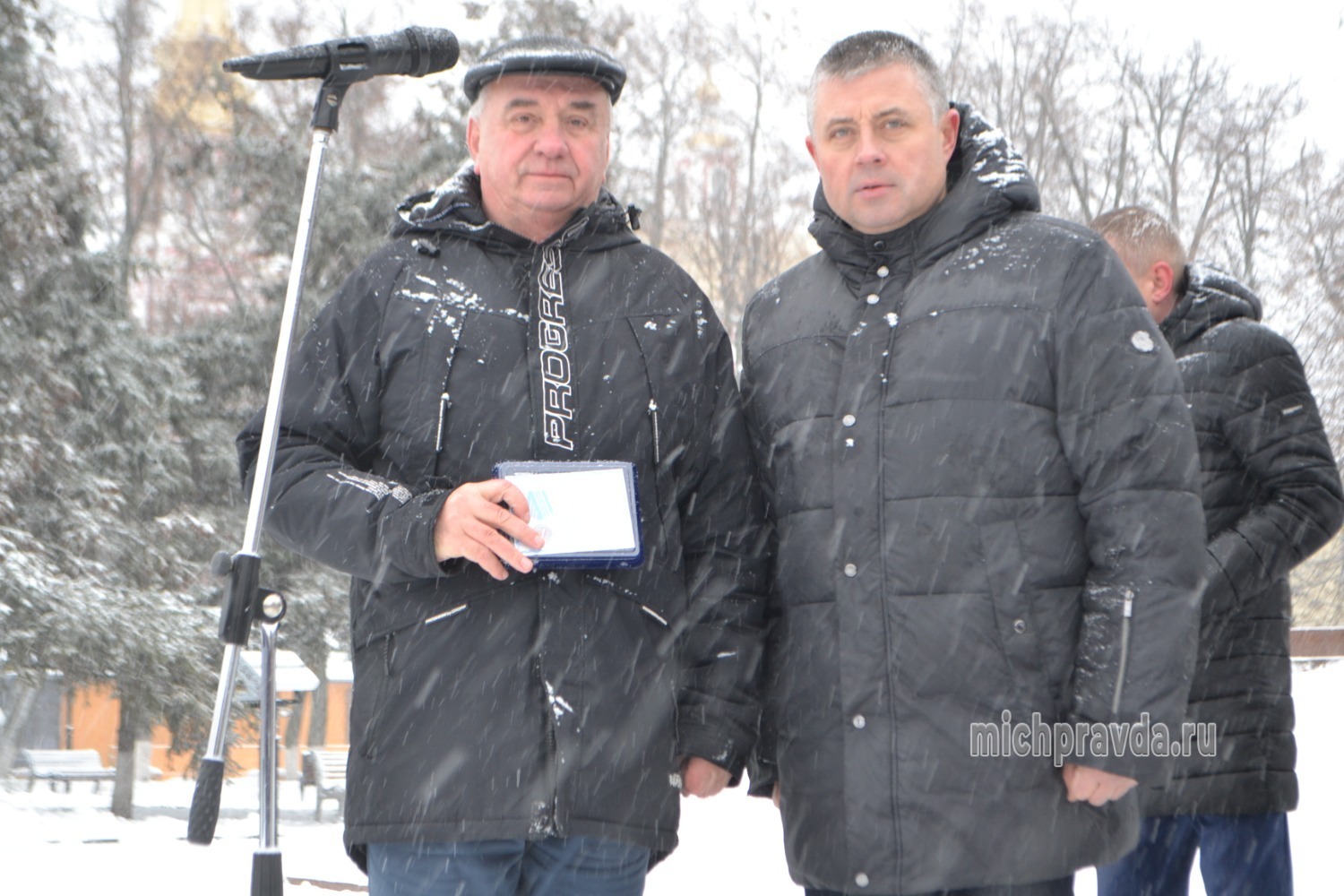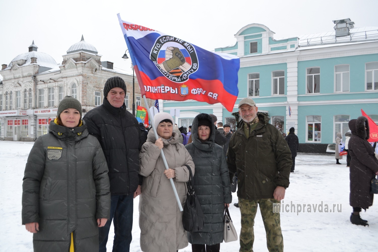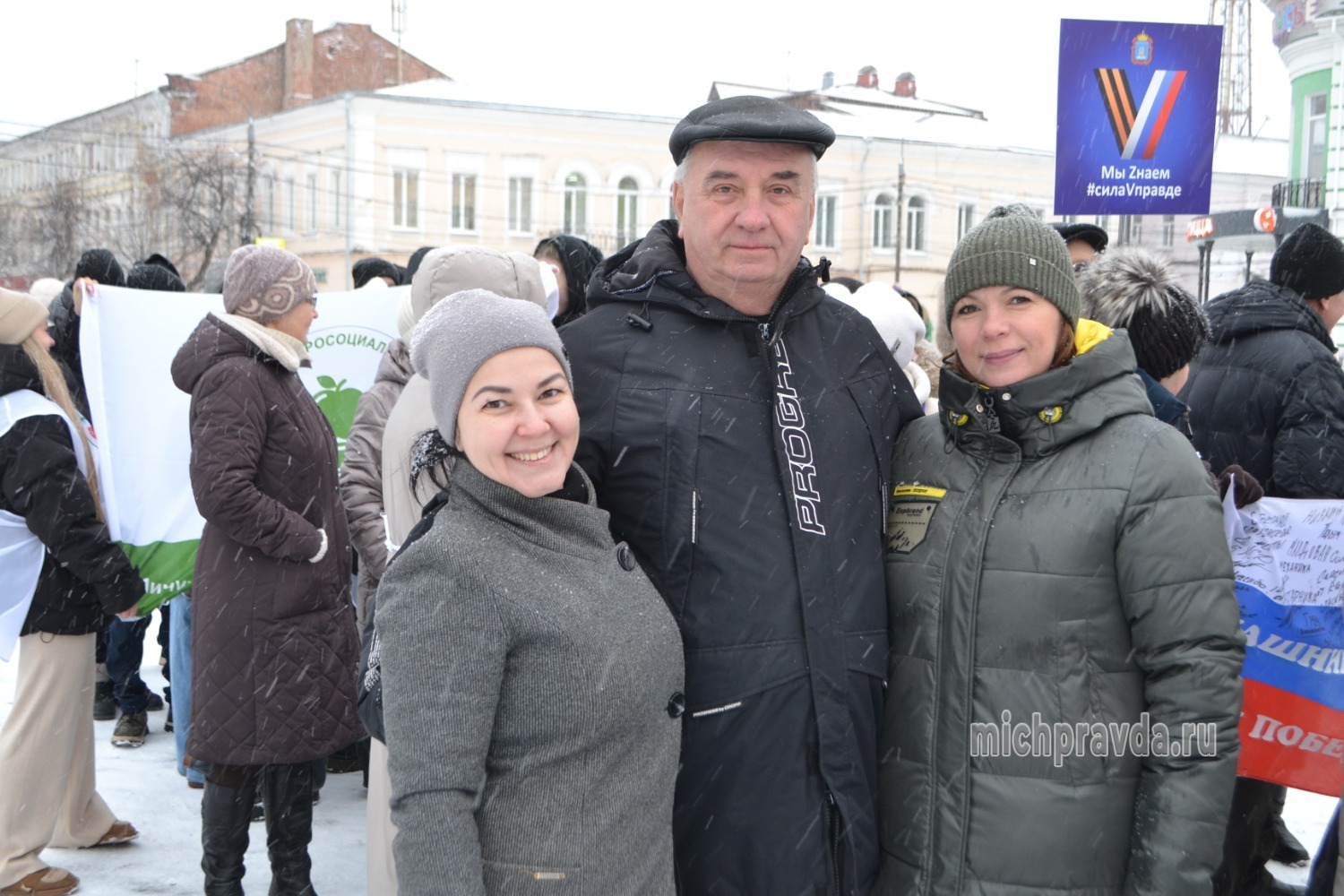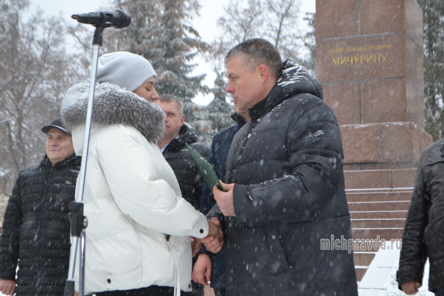 Дойдя до центральной площади, активисты приготовились принимать слова поздравления. С приветственным словом к собравшимся обратились — глава Мичуринска Максим Харников, председатель городского Совета депутатов Константин Горлов, заместитель главы администрации Мичуринского округа Александр Сушков, депутат Тамбовской областной Думы Александр Сухарев, исполняющий обязанности заместителя директора департамента — начальника отдела реализации, патриотических и добровольческих проектов Алексей Козин, руководитель межмуниципального отделения Ассоциации ветеранов специальной военной операции Андрей Дементьев.