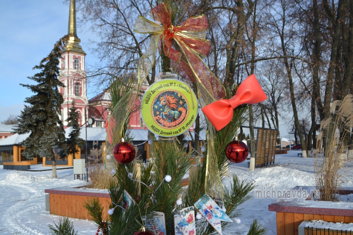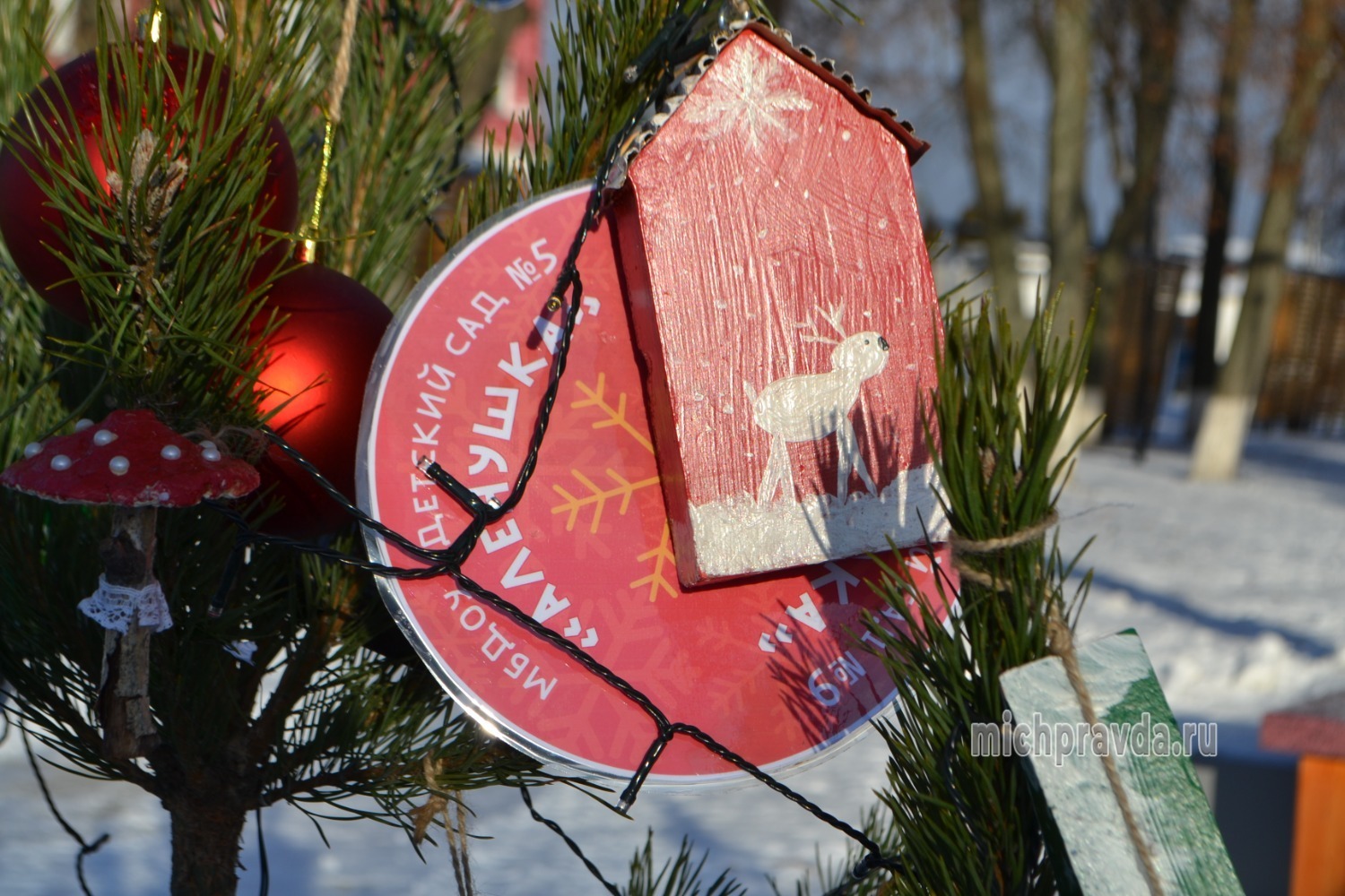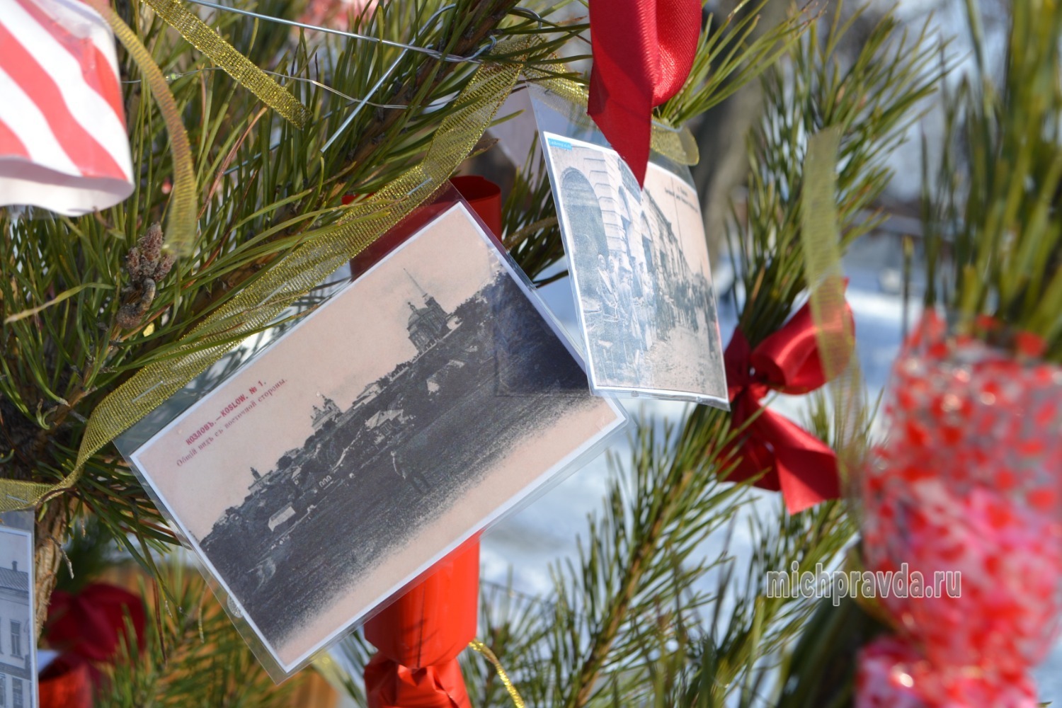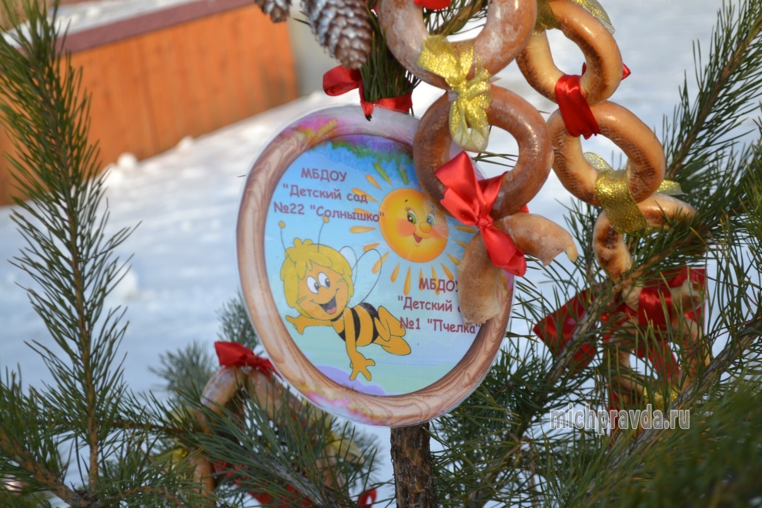 Ёлочки украсили игрушками, репринтными изданиями дореволюционных открыток с видами Козлова, домиками с резными наличниками, фигурками лошадей, бантиками, настоящими баранками, фигурными пряниками, колокольчиками... Это оформление хвойных деревьев сделали своими руками сотрудники мичуринских детских садов.