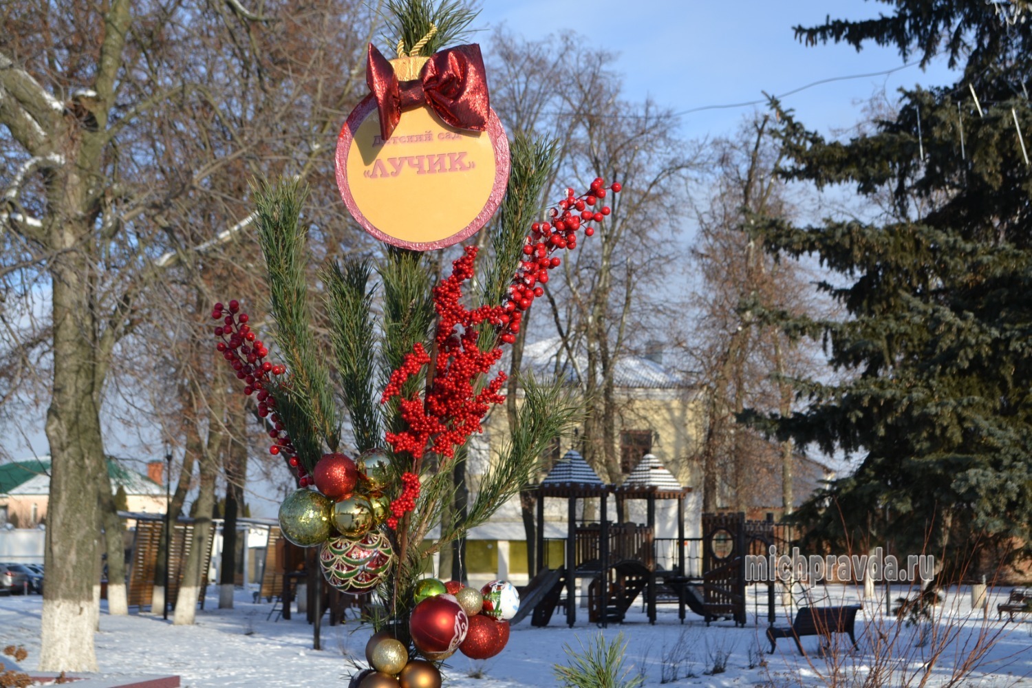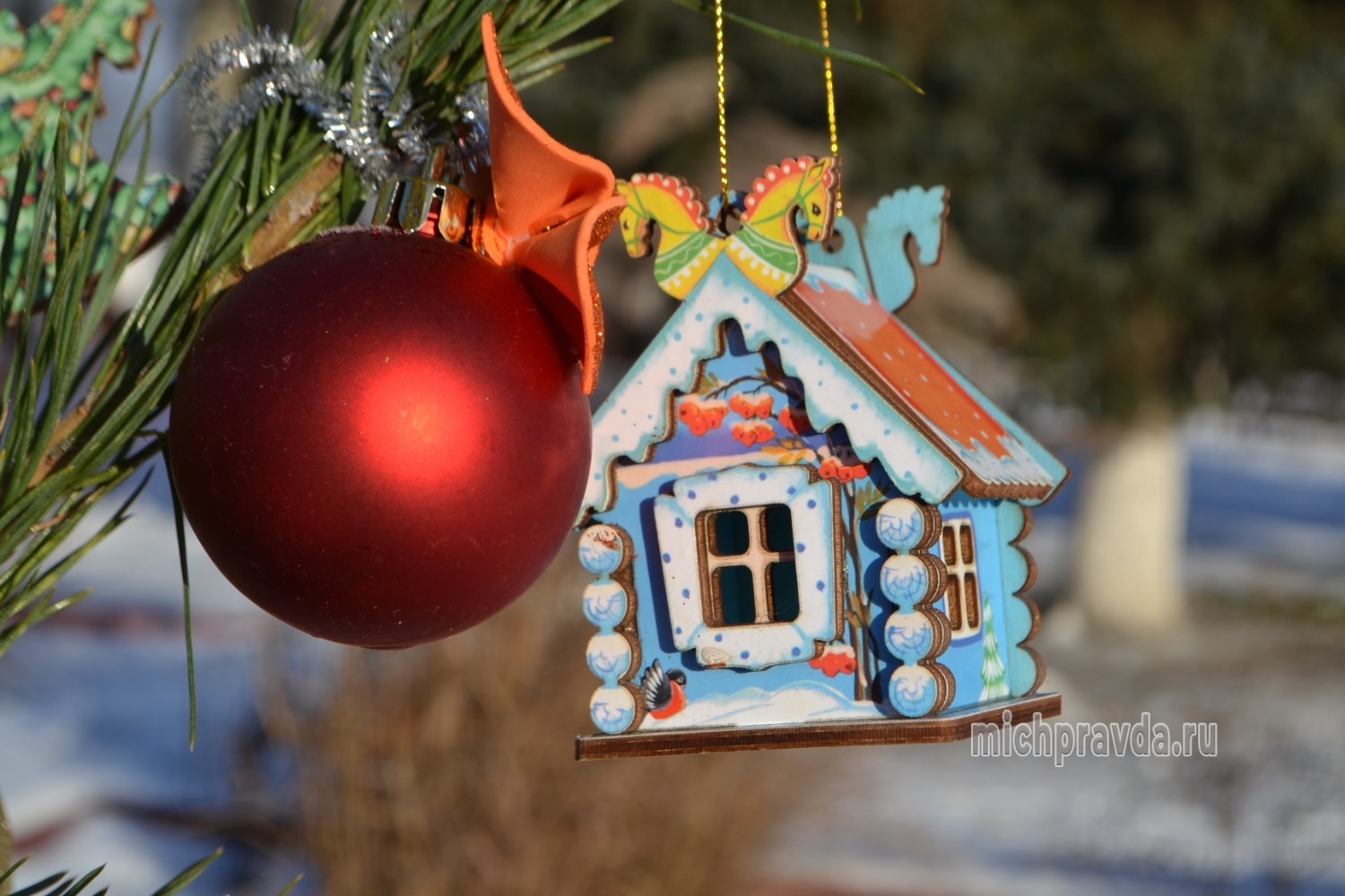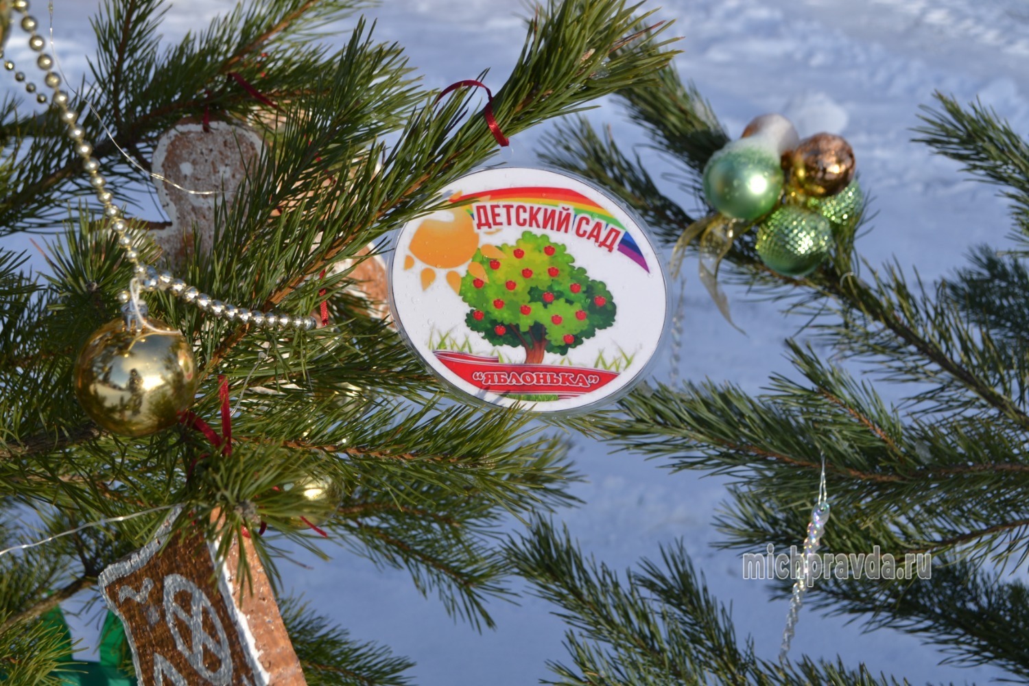 Ёлочки украсили игрушками, репринтными изданиями дореволюционных открыток с видами Козлова, домиками с резными наличниками, фигурками лошадей, бантиками, настоящими баранками, фигурными пряниками, колокольчиками... Это оформление хвойных деревьев сделали своими руками сотрудники мичуринских детских садов.