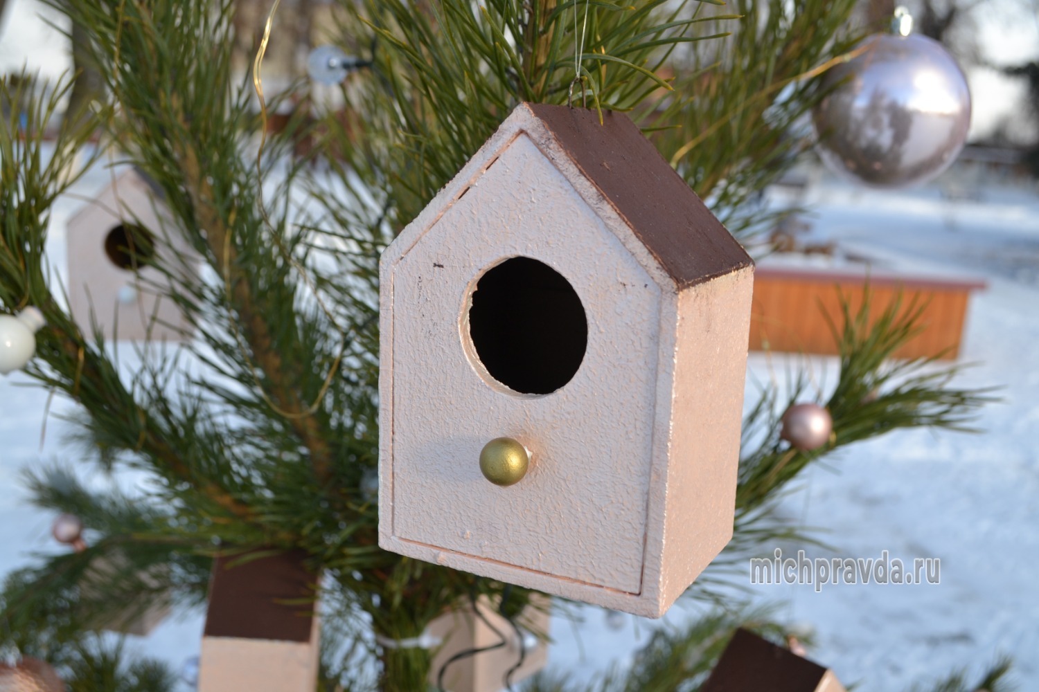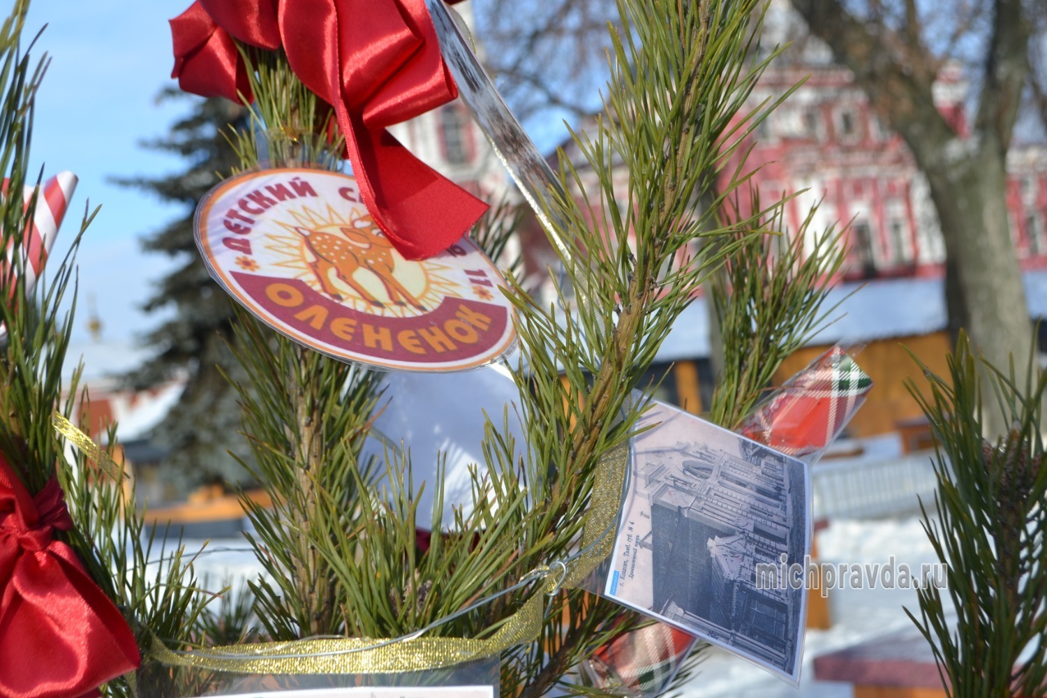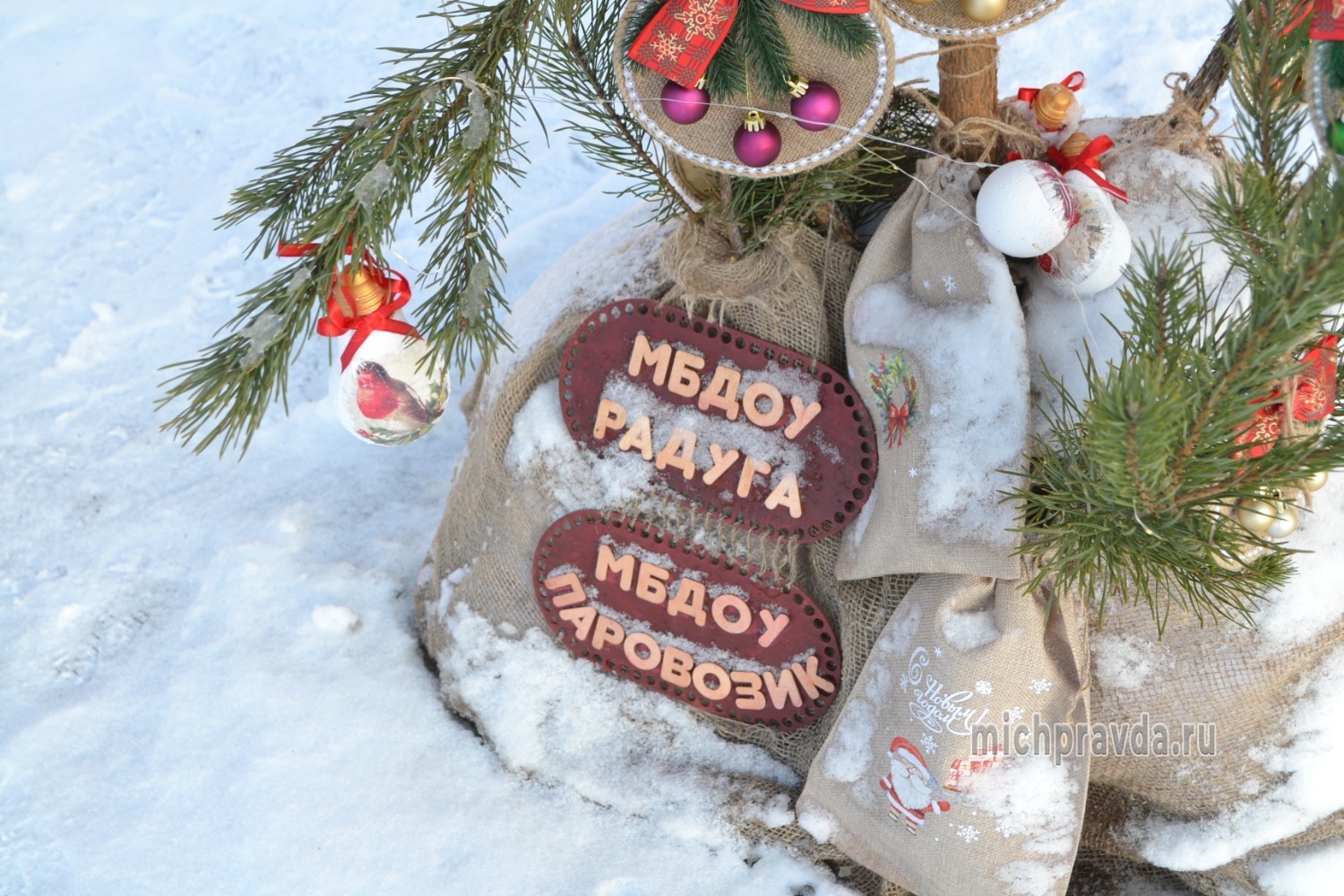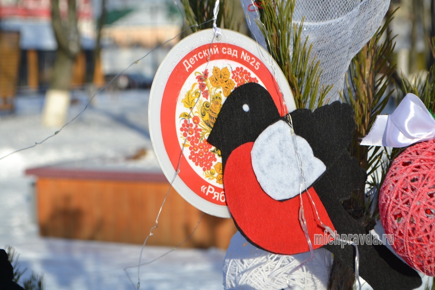 Ёлочки украсили игрушками, репринтными изданиями дореволюционных открыток с видами Козлова, домиками с резными наличниками, фигурками лошадей, бантиками, настоящими баранками, фигурными пряниками, колокольчиками... Это оформление хвойных деревьев сделали своими руками сотрудники мичуринских детских садов.