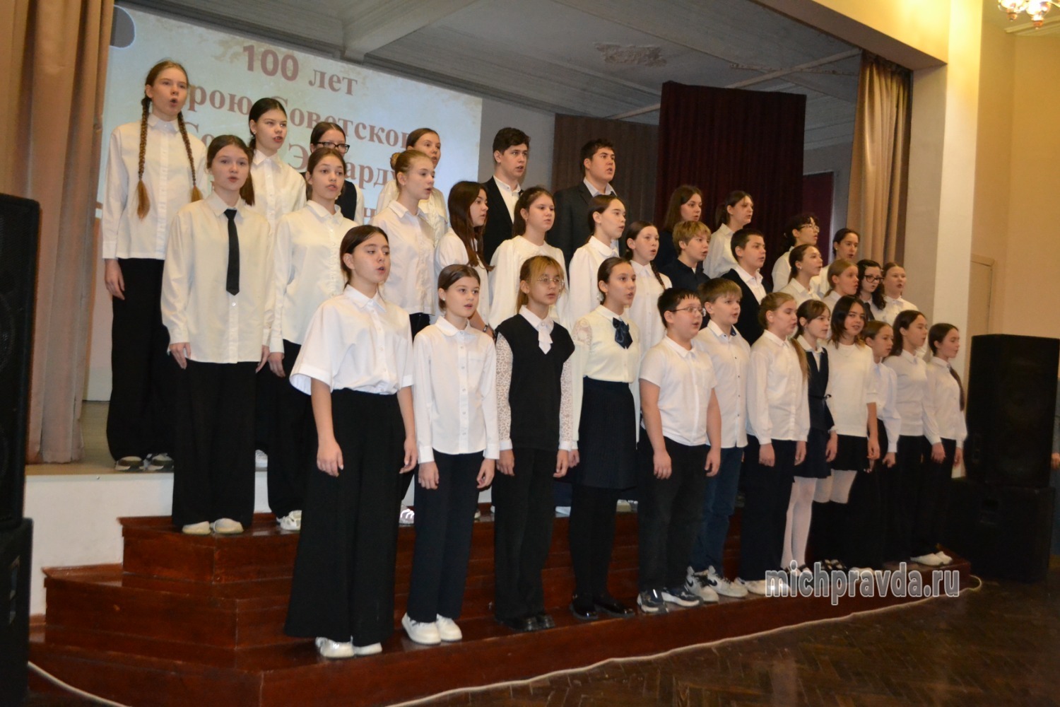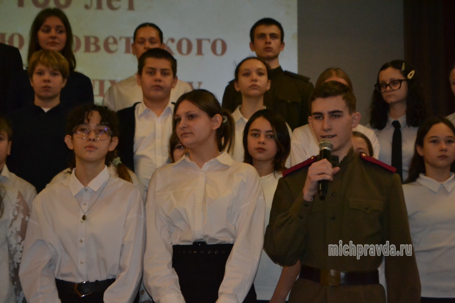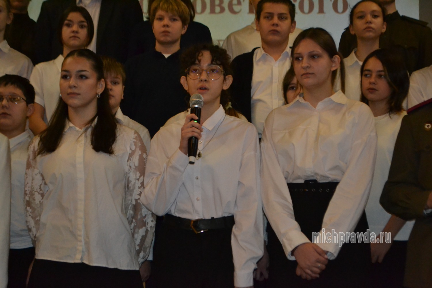 Ученики под наставничеством педагогов подготовили творческие номера. Школьный хор исполнил песни, звучащие в советских кинокартинах о подвигах защитников Отечества. «От героев былых времён» нам известна благодаря драме «Офицеры» (6+), а «С чего начинается Родина» — рефрен многосерийного телефильма «Щит и меч» (6+).