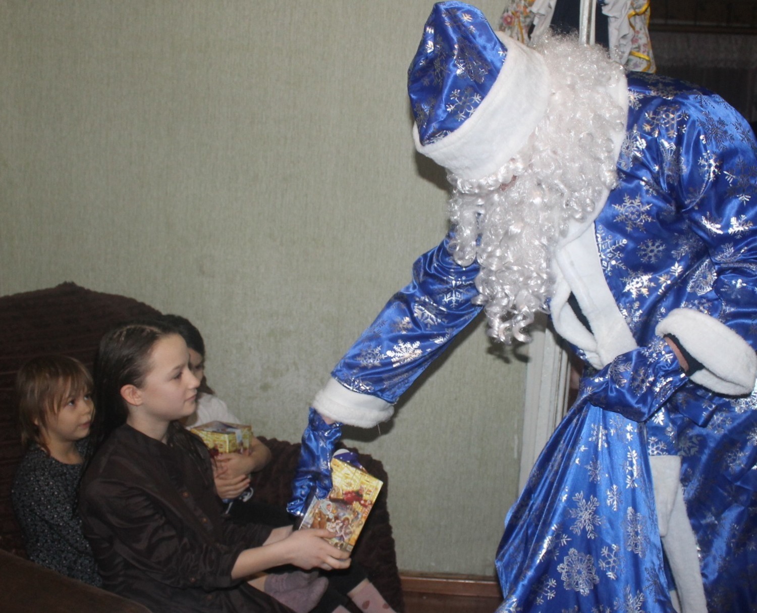 Искреннее изумление, а затем безудержный восторг загорались в детских глазах, когда на пороге их дома появлялись Дед Мороз и Снегурочка. Самые смелые малыши, не веря в реальность чуда, трогали волшебную бороду, а затем с радостью выбирали подарки из огромного мешка.