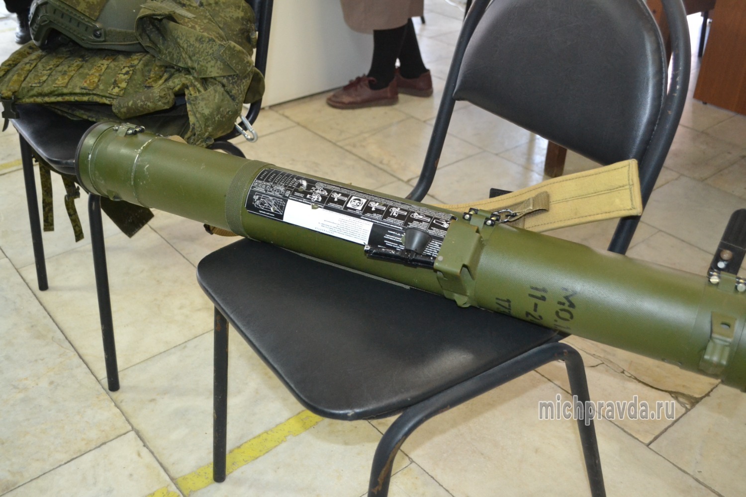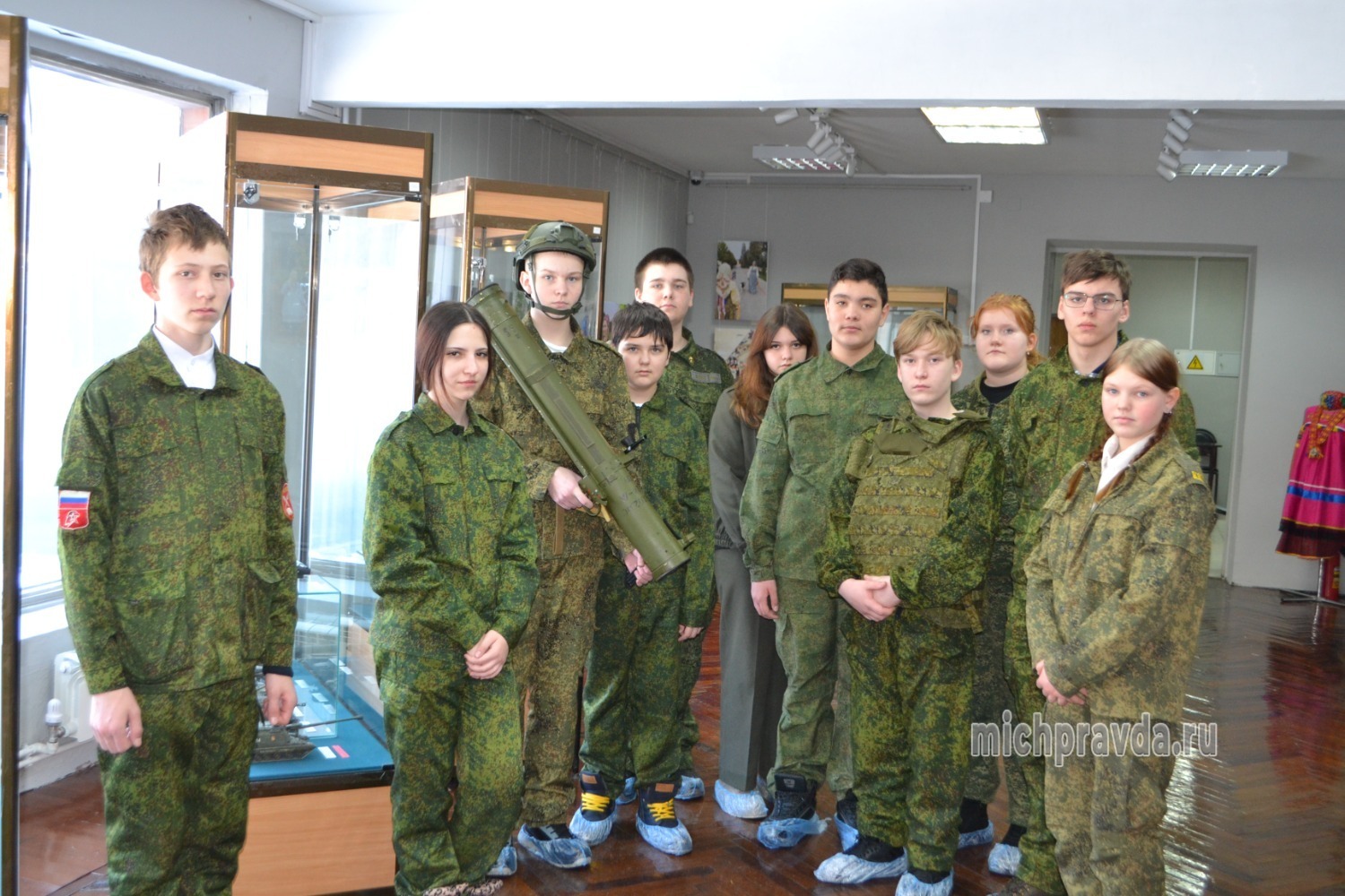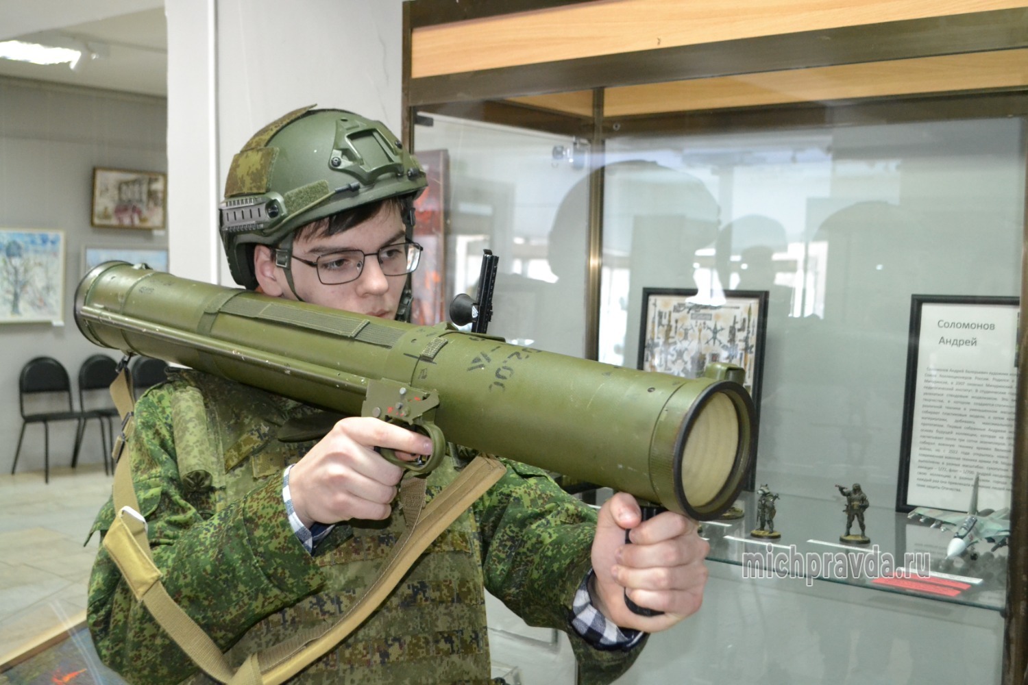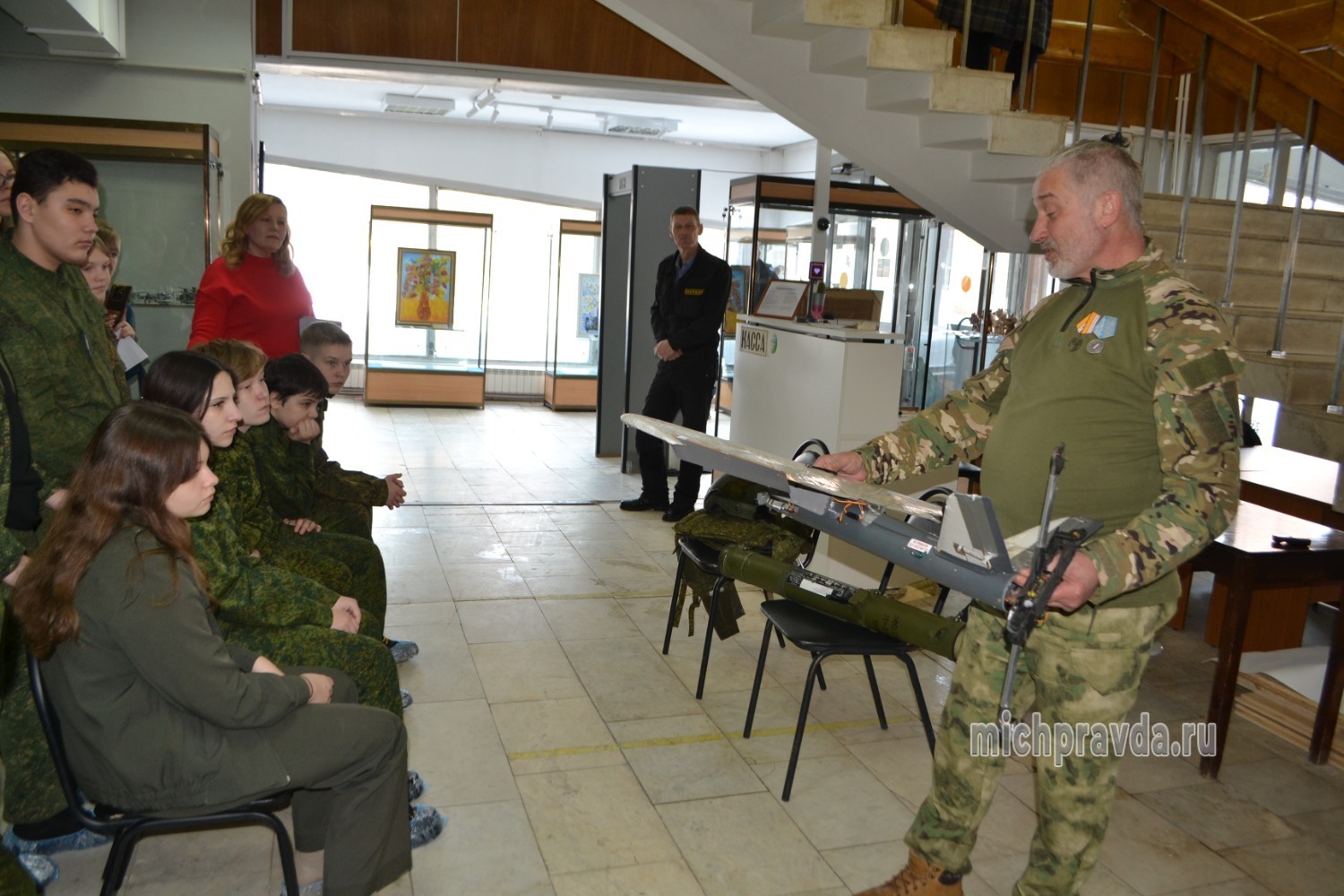 Он привёз с собой для демонстрации школьникам бронежилет, каску, обезвреженные трофеи СВО в виде дронов, мин, фрагментов боевой техники, повреждённых поражающими элементами, сбитый украинский БПЛА, а также макет огнемёта «Шмель». Всё это вызвало большой интерес у подростков, которые примеряли военную амуницию и позировали для фото с предметами вооружения.